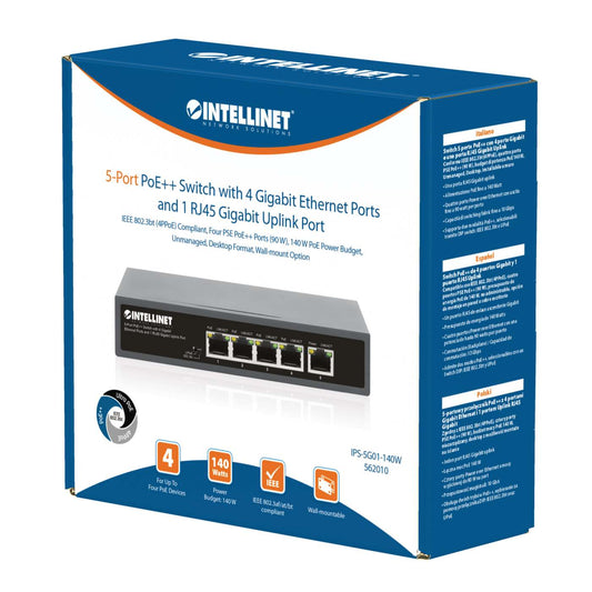 IEEE 802.3bt (4PPoE) Compliant, Four PSE PoE++ Ports (90 W), 140 W PoE Power Budget, Unmanaged, Desktop Format, Wall-mount OptionSKU: 562010 [IPS-5G01-140W]Vendor:IntellinetRegular price $213.99 USDRegular priceUnit price / perSale price $213.99 USD -