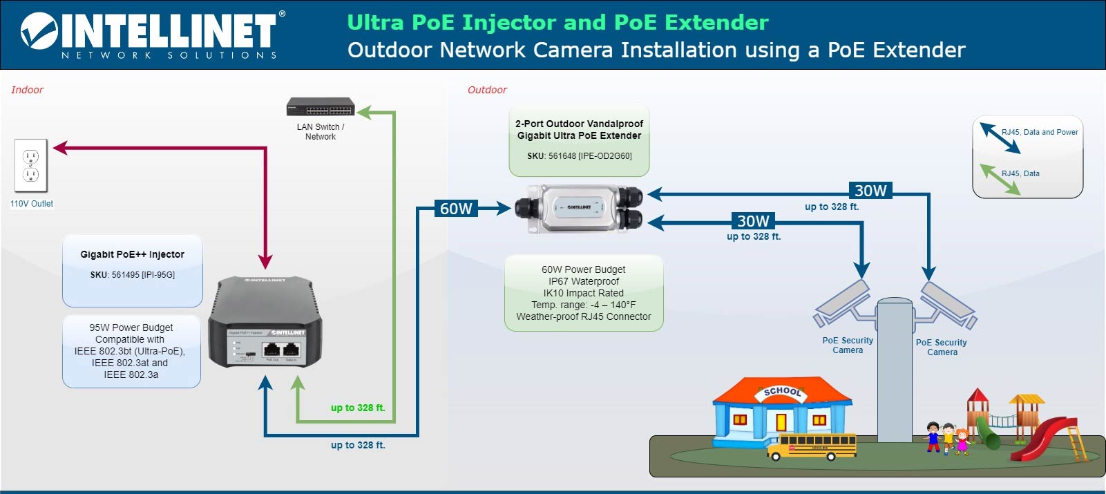 The Intellinet Network Solutions 2-Port Outdoor Vandalproof Gigabit Ultra PoE Extender adds up to 100 m (328 ft.) to the connection distance from a PoE source to one or two output devices via Cat5e or Cat6 cable. This PoE++ (4PPoE) extender does not need an additional power supply since it draws its power from the PoE input.