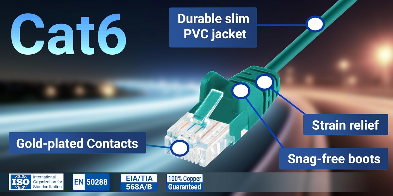 Cat6 U/UTP Slim Network Patch Cable, 10 ft., Green, 10-Pack